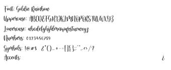 Goldie Rainbow, eğlenceli ve zarif bir kişilik sunan, el yazısı tarzında bir fonttur. Hafif ve havadar bir his ile vintage romantizmi birleştiren akıcı ve el ile çizilmiş hatlarıyla, sıcaklık ve yaratıcılığı ifade etmek isteyen tasarımlar için idealdir. Font ailesi, zarif, fırça benzeri düzenli ağırlıklardan daha dokulu ve cesur varyasyonlara kadar çeşitli stiller sunmaktadır.